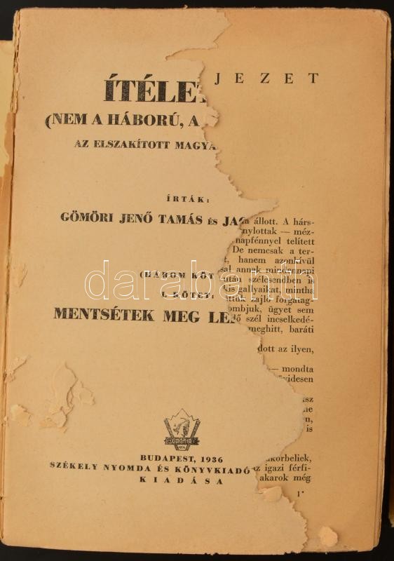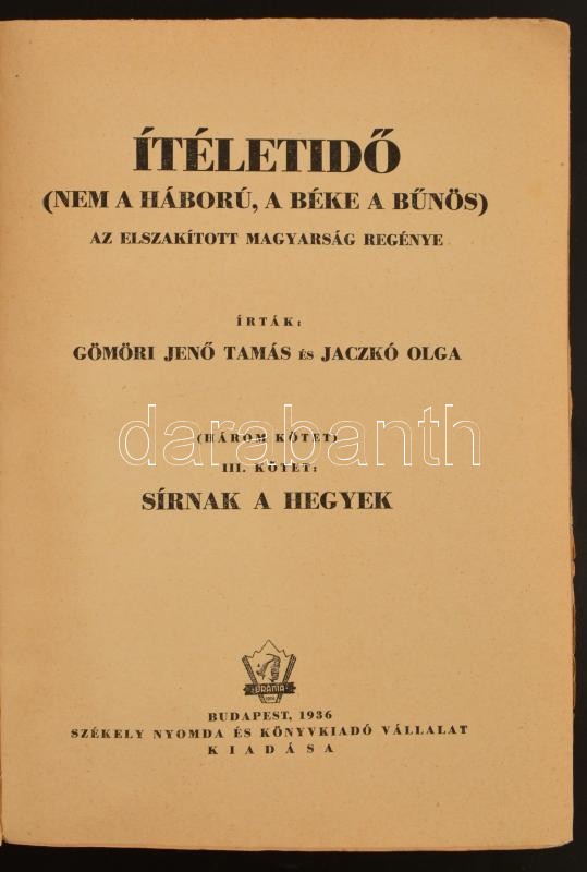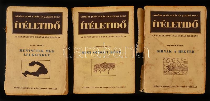 Gömöri Jenő Tamás, Jaczkó Olga: Ítéletidő. (Nem a háború, a béke a bűnös.) Az elszakított magyarság regénye. I. -III. kötet:. Bp., 1936, Székely Nyomda és Könyvkiadó Vállalat, Kiadói papírkötés kisebb nagyobb sérülésekkel