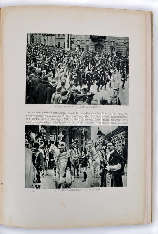 Koronázási album. Ábrányi Emil, Ambrus Zoltán, Gróf Andrássy Gyula, Gróf Apponyi Albert, Beöthy Zsolt, Berzeviczy Albert, Heltai Jenő, Herczeg Ferenc, Kabos Ede, Gróf Khun-Héderváry Károly, Kiss József, Krúdy Gyula, Molnár Ferenc, Móricz Zsigmond, Rákosi Viktor, Szomaházy István, Báró Wlassics Gyula eredeti közleményeivel. Bató József, Bér Dezső, Csont Ferenc, Dudits Andor, Endrey Sándor, Gedő Lipót, Herman Lipót, Honti Nándor, Komáromi-Kacz Emőke, Pólya Tibor, Pór Bertalan, Rippl-Rónai József, Rudnay Gyula, Végh Gusztáv, Vészi Margit, Zádor István eredeti rajzaival és festményeivel. Bp., 1917, Érdekes Újság,(Légrády-ny.). Gazdag szövegközti és egész oldalas képanyaggal. Kiadói aranyozott egészvászon-kötésben, az elülső kötéstáblán aranyozott koronás díszítéssel, a színes IV. Károly kép sérült, viseltes, kijár, kissé kopott borítóval, a gerincen kis sérüléssel.