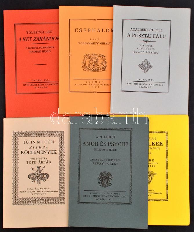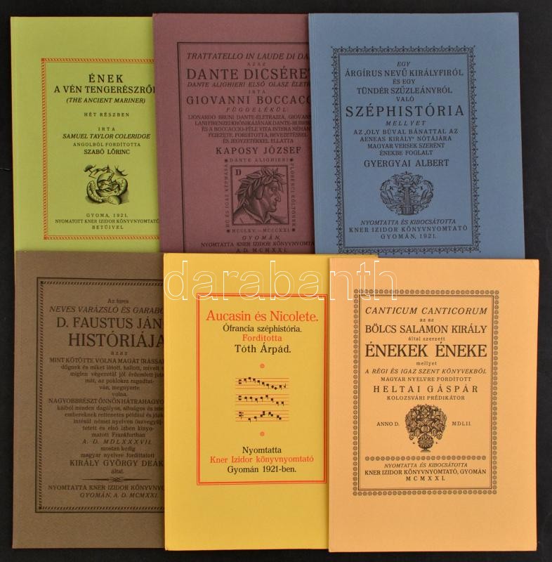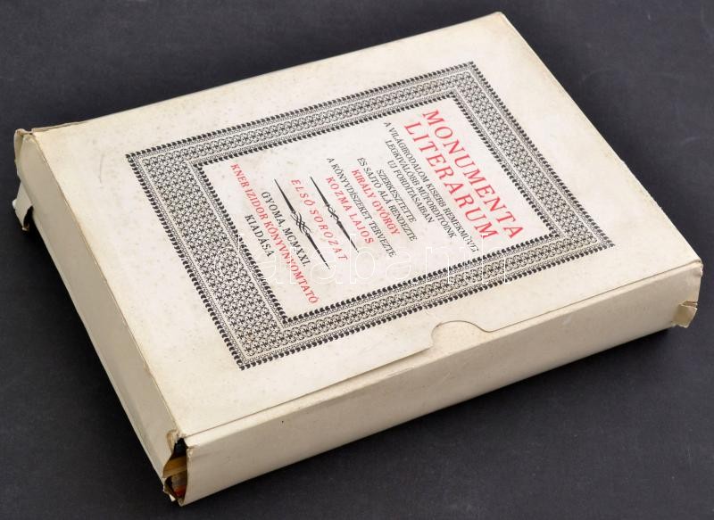 Monumenta literarum. A világirodalom kisebb remekművei legkiválóbb műfordítóink új fordításaiban. Szerk.: Király György. 1. sorozat. Bp., 1982, Magvető. Az 1921-1922. évi kiadás (Gyoma, Kner) hasonmás kiadása. Papírkötésben, papír védőborítóval, jó állapotban.