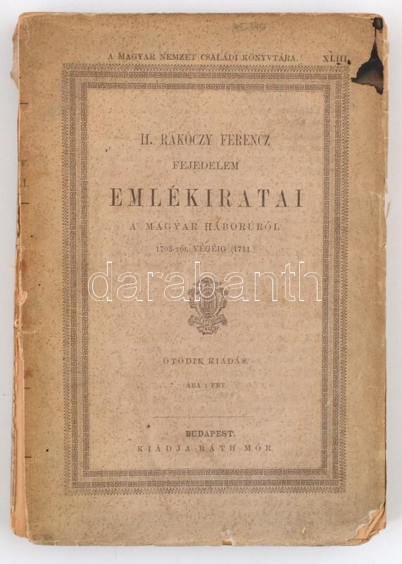 II. Rákóczy Ferenc fejedelem emlékiratai a magyar háborúról, 1703-tól végéig. (1711.) Közli Thaly Kálmán. Bp.,(1872), Ráth Mór, VIII+9-335+1 p. Ötödik, javított, történelmi jegyzetekkel kísért, Rákóczy végrendeletével és a bujdosók sírfelirataival bővített kiadás. Kiadói papírborítóban, borító lejár.