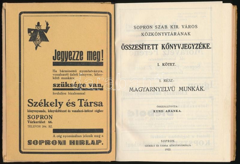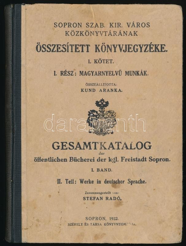 Sopron szab. kir. város közkönyvtárának összesített könyvjegyzéke. I. kötet. Magyarnyelvű munkák. Összeállította: Kund Aranka. Sopron, 1932, Székely és Társa, VII+383 p. Korabeli reklámokkal. Magyar és német nyelven. Kiadói félvászon-kötés.