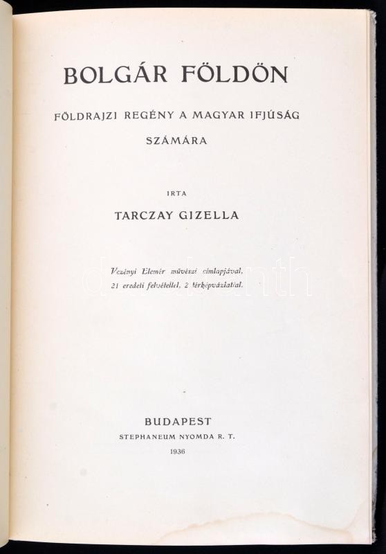 Tarczay Gizella: Bolgár földön. Földrajzi regény a magyar ijfúság számára. Bp., 1936, Stephaneum. Kiadói illusztrált félvászon kötés, kissé kopott borítóval, foltos, intézményi bélyegzővel.