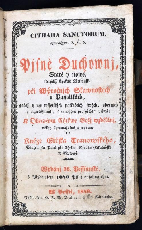 Třanovský, Jiří: Cithara sanctorum. Pjsně Duchownj wydané. Pest, 1849. Trattner. Szlovák imádságoskönyv. Rézlemezekkel, fémkapcsokkal díszített egészbőr kötésben / Slovakian prayer book with full leather binding with copper parts 13x20 cm