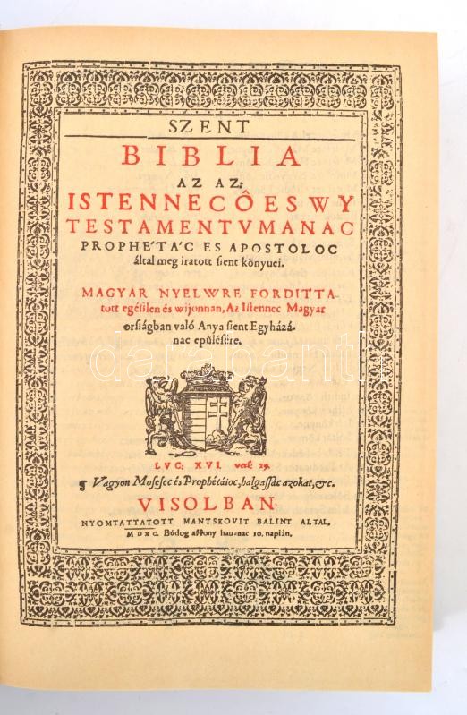 Vizsolyi Biblia. I-II. köt. Bp., 1981, Helikon Kiadó, (Kner Nyomda.) Kiadói aranyozott, bordázott gerincű, dombornyomott műbőr kötés, kísérőfüzettel, (Szántó Tibor: Károlyi Gáspár Vizsolyi Bibliája. Bp., 1981, Helikon. Kiadói papírkötés.) Facsimile kiadás. Kiadói kartontok nélkül, jó állapotban!
