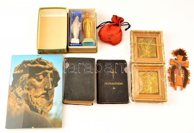Leírás: 9 db kegytárgy: figura, kép, imakönyv