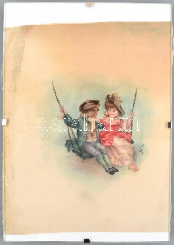 Leírás: F. jelzéssel: Hintázók, textilre festett kép, üveg keretben, 17×13 cm