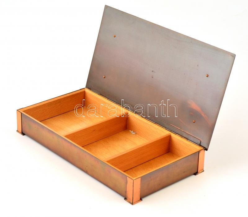 Leírás: Iparművész réz doboz, fa betéttel, jelzett (Kállay), 24,5×12,5 cm