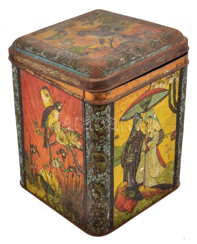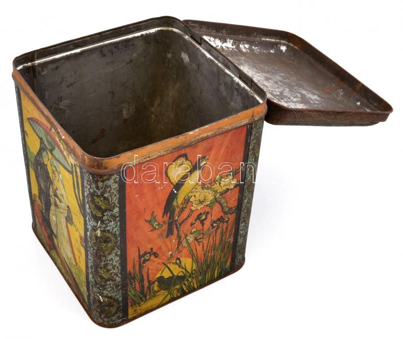 Leírás: Nagyméretű régi fém teásdoboz. 22x29x22 cm