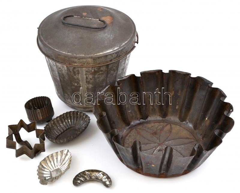 Leírás: Régi cukrász tárgyak: 1 db nagy pudingforma, 5 db süteménykiszúró, 1 db kuglófforma