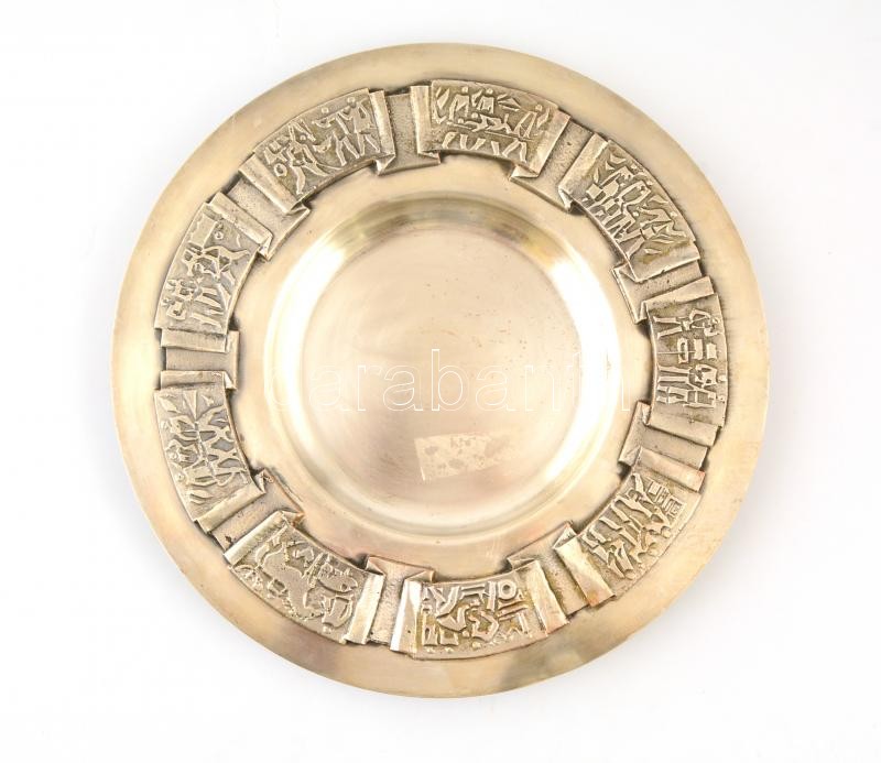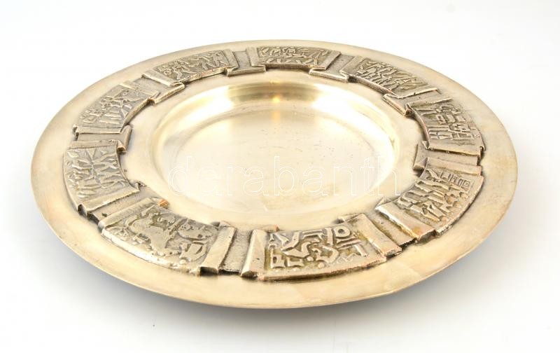 Leírás: Relieffel díszített ón fali dísztányér. d:33 cm