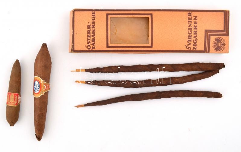 Vegyes szivar tétel, benne: 3 db szivar Österreich Tabak Regie 5 Virginier Zigarren dobozban, rajta kétfejű sasos osztrák címerrel, h: 21,5 cm, doboz: 6x21x1,5 cm+1 db szivar, I. Ferenc József arcképével díszített szivargyűrűvel, és 1 db szivar, koronás nagycímeres szivargyűrűvel, h: 13 cm, 9,5 cm