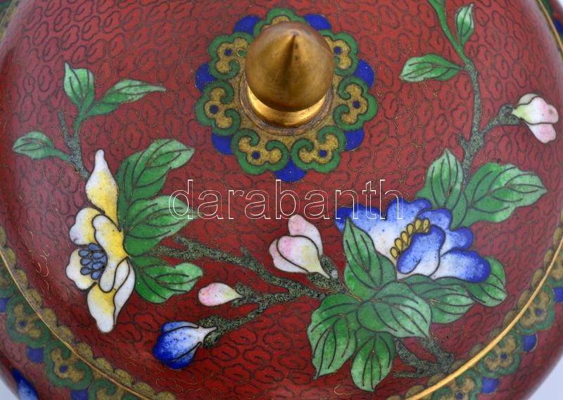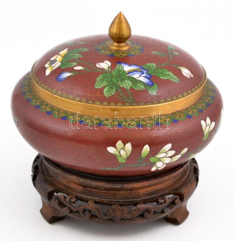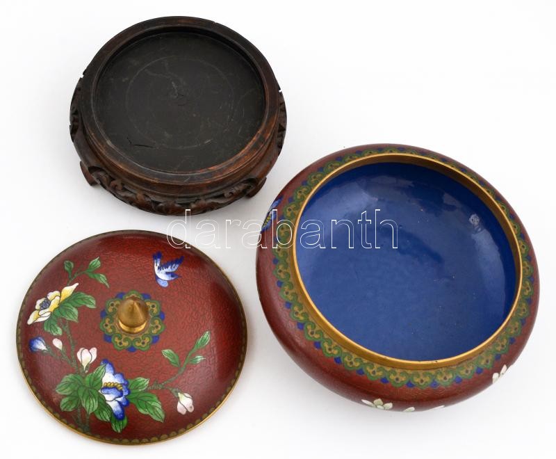 Leírás: Zománcozott réz bonbonier, apró kopásnyomokkal, fa tartóval, m: 12 cm, d: 17 cm