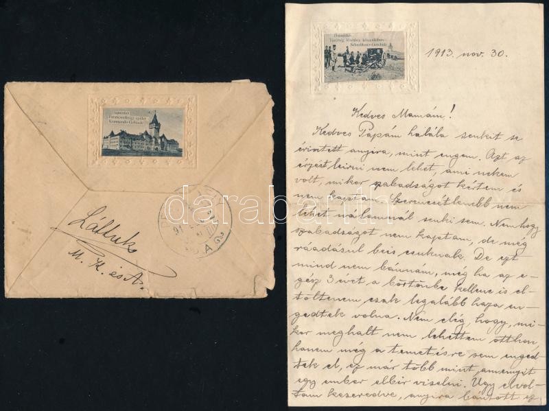 1913 Hajmáskér, Klinger Imre katona kesergő levele haza édesanyjának, mert nem engedték haza édesapja temetésére, borítékkal, a borítékon és a levélen a Hajmáskéri laktanya benyomott képeivel.