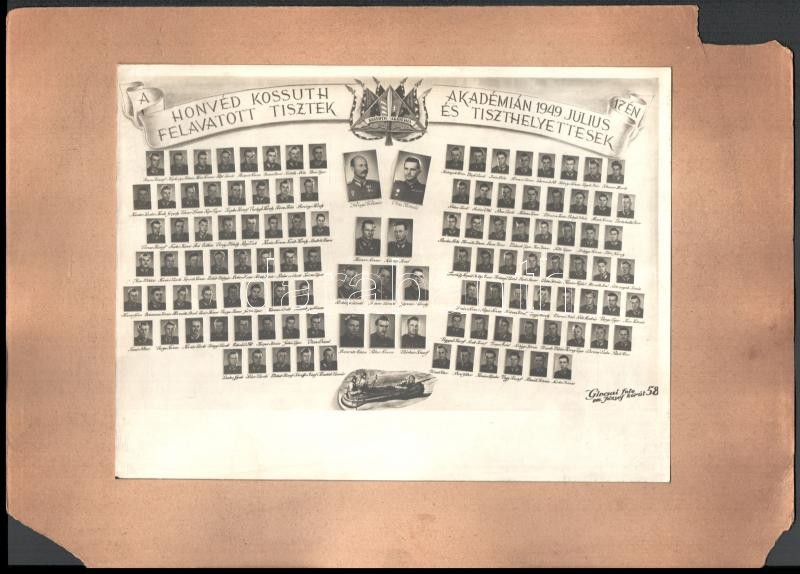 Leírás: 1949 Honvéd Kossuth Akadémián felavatott tisztek és tiszthelyettesek, iskolai tablófotó kartonon, (Ginczei fotó), karton sérült, hiányos, 14x23 cm