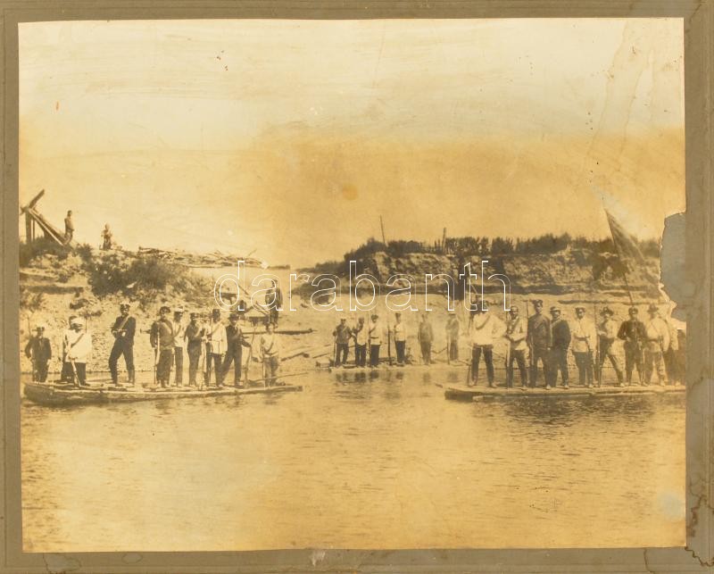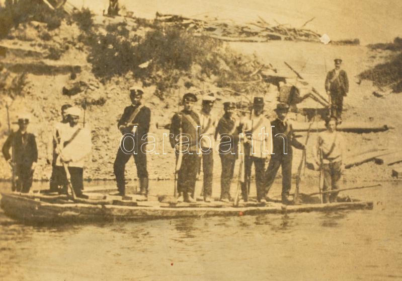 Leírás: Szerb katonák a Duna alsó szakaszán ladikokon. Nagyméretű fotó kartonon. 30x23 cm + karton. / Serbian soldiers on the Danube. Large photo on cartboard