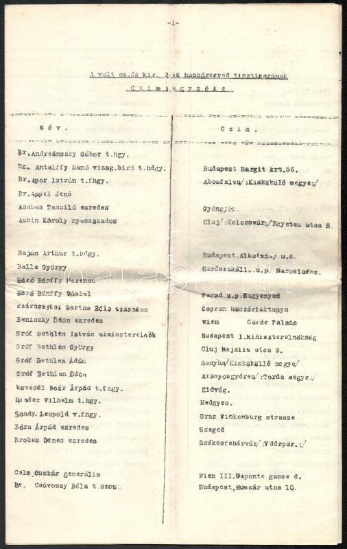 cca 1920-1930 A volt cs. és kir. 2. huszárezred tisztikarának címjegyzéke, rajta gróf Bethlen István miniszterelnök, Fáy István,Orczy Lőrinc gróf Pallavicini János, és más ismert emberrel, Éder Győző/Viktor (1890-1980) huszár százados hagyatékából, 5 p.