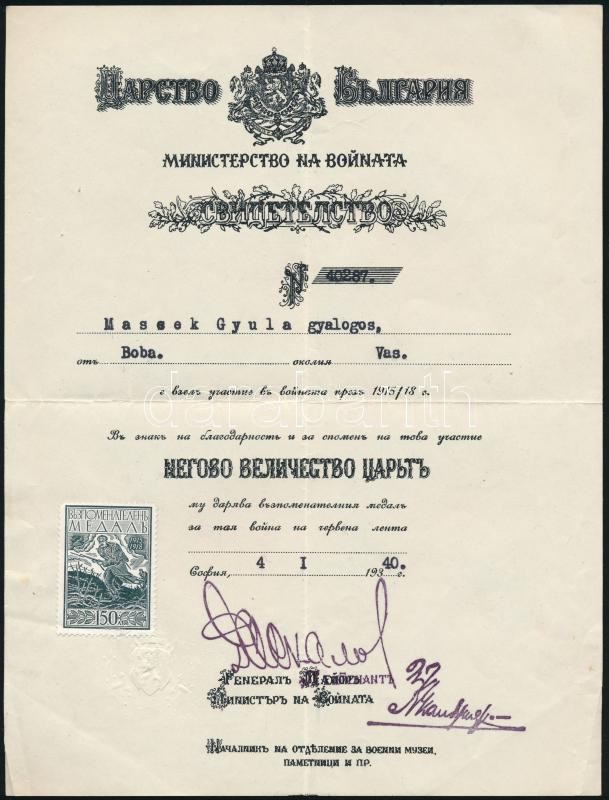 cca 1940 Katonai igazolvány és bolgár kitüntetés adományozó lap egyazo... https://www.darabanth.com/hu/359-Gyorsarveres/359.0/Mutargy-papirregiseg-egyeb/Militaria~500028/cca-1940-Katonai-igazolvany-es-bolgar-kituntetes-adomanyozo-lap-egyazon-szemely-reszere~II2064266