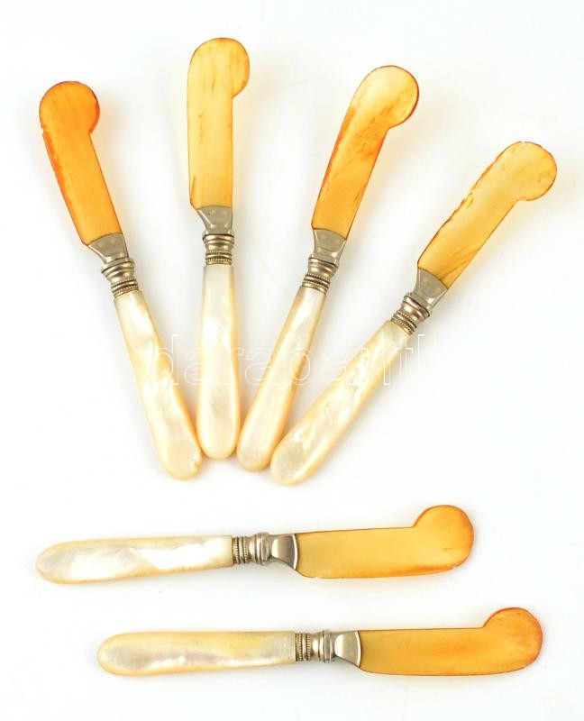 Leírás: Kaviáros kések. Gyöngyház nyél, szaru, ezüstözött. 6 db 14 cm
