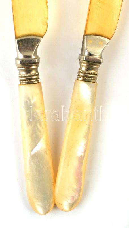 Kaviáros kések. Gyöngyház nyél, szaru, ezüstözött. 6 db 14 cm https://www.darabanth.com/hu/359-Gyorsarveres/359.0/Mutargy-papirregiseg-egyeb/Mutargyak-antikvitas~500005/Kaviaros-kesek-Gyongyhaz-nyel-szaru-ezustozott-6-db-14-cm~II2065648