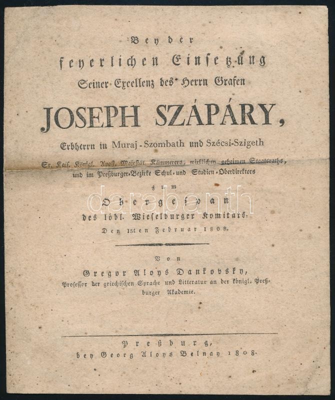 1808 gróf Szapáry Józsefet dicsőítő költemény. 4p. Pozsony, 1808. https://www.darabanth.com/hu/359-Gyorsarveres/359.0/Mutargy-papirregiseg-egyeb/Nyomtatvanyok~500030/1808-grof-Szapary-Jozsefet-dicsoito-koltemeny-4p-Pozsony-1808~II2064736