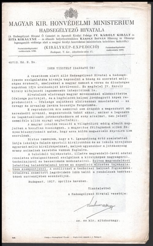 Leírás: 1917 Bp., A Magyar Kir. Honvédelmi Ministerium Hadsegélyező Hivatala királykép-expedíciójának tájékoztatója