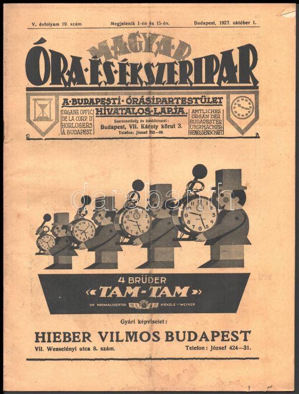 1927 Bp. Magyar Óra és Ékszeripar. A budapesti órásipartestület hivata... https://www.darabanth.com/hu/359-Gyorsarveres/359.0/Mutargy-papirregiseg-egyeb/Nyomtatvanyok~500030/1927-Bp-Magyar-Ora-es-Ekszeripar-A-budapesti-orasipartestulet-hivatalos-lapja-V-evfolyam-~II2061906