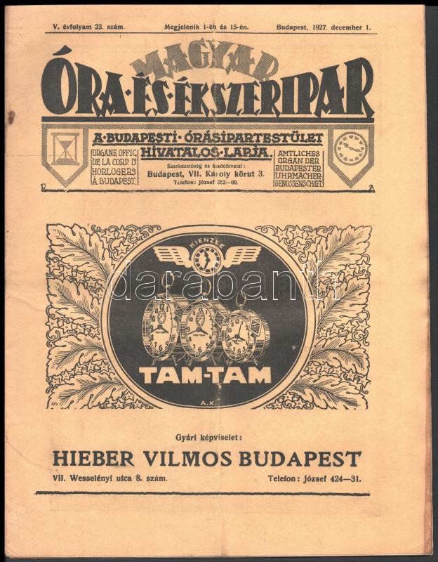 1927 Bp. Magyar Óra és Ékszeripar. A budapesti órásipartestület hivata... https://www.darabanth.com/hu/359-Gyorsarveres/359.0/Mutargy-papirregiseg-egyeb/Nyomtatvanyok~500030/1927-Bp-Magyar-Ora-es-Ekszeripar-A-budapesti-orasipartestulet-hivatalos-lapja-V-evfolyam-~II2061921