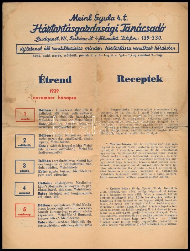 1939 Meinl Gyula Rt. háztartási tanácsadója, étrend/receptek, szakadt,... https://www.darabanth.com/hu/359-Gyorsarveres/359.0/Mutargy-papirregiseg-egyeb/Nyomtatvanyok~500030/1939-Meinl-Gyula-Rt-haztartasi-tanacsadoja-etrendreceptek-szakadt-foltos-4-p~II2063902