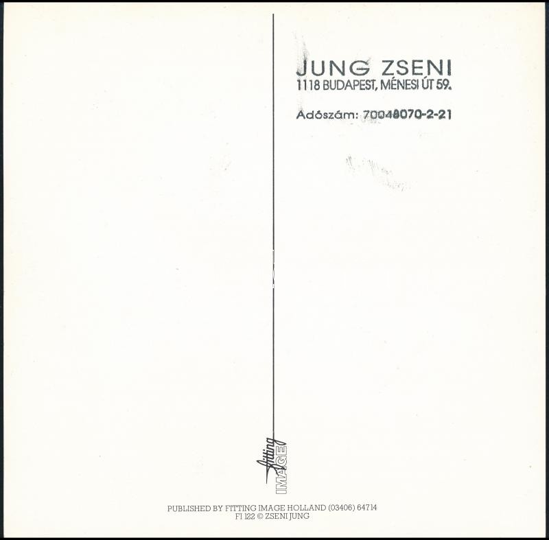 Leírás: Jung Zseni (1940-) képeslap, hátoldalon pecséttel, nyomtatott aláírással
