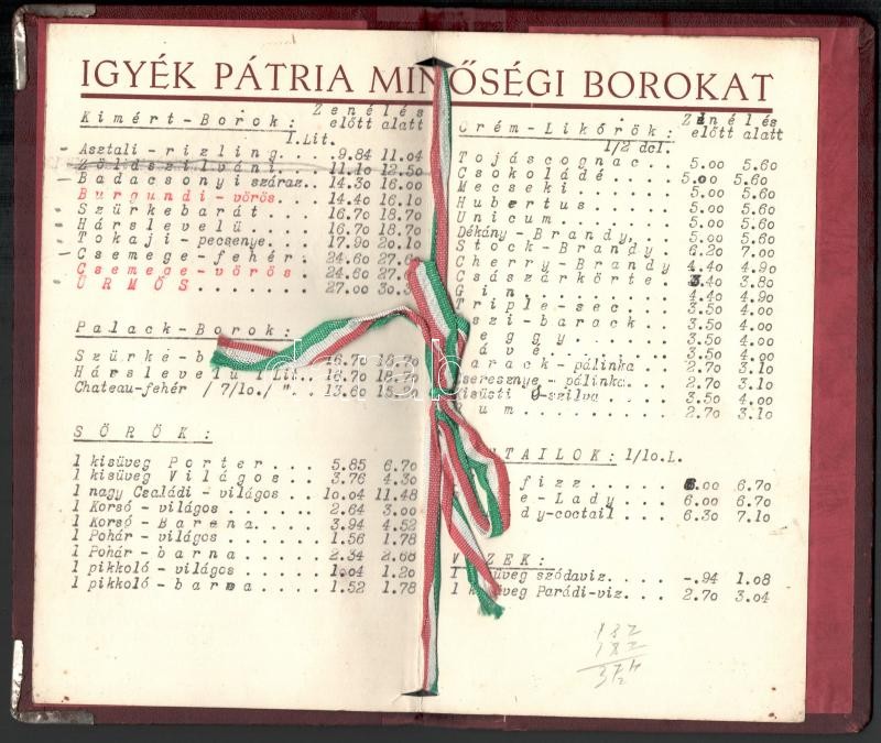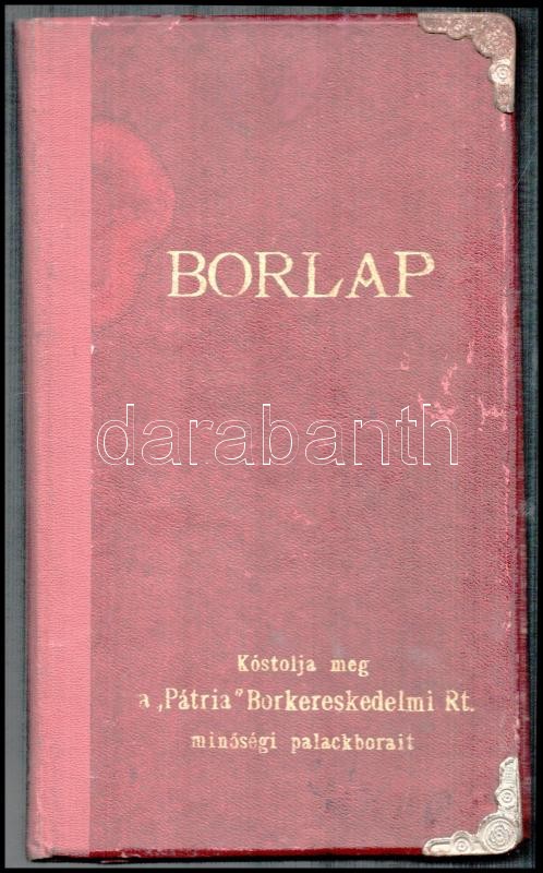 Leírás: cca 1930 Pátria Borkereskedelmi Rt. borlap. "Igyék Pátria minőségi borokat" Egészvászon kötésben, díszes fém sarokveretekkel 22 cm