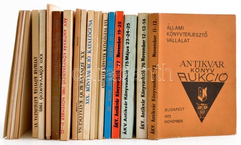cca 1972-1985 Állami Könyvterjesztő Vállalat antikvár könyv aukciós katalógusai, 14 db, benne részben bejegyzett leütési árakkal. Valamint ehhez kapcsolódó egyéb nyomtatványok és jegyzékek.