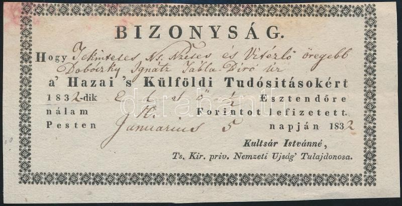 Leírás: 1832 Bizonyság befizetésről a Nemzeti Újság számára 16x9 cm