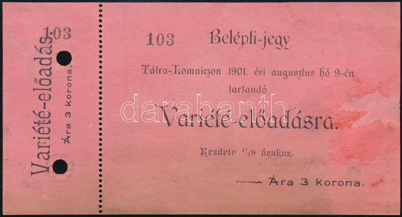 1901 Belépőjegy Tátralomnicon rendezett varieté előadásra https://www.darabanth.com/hu/359-Gyorsarveres/359.0/Mutargy-papirregiseg-egyeb/Okmanyok~500018/1901-Belepojegy-Tatralomnicon-rendezett-variete-eloadasra~II2064998