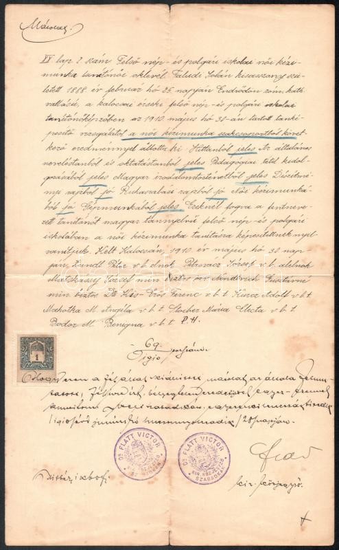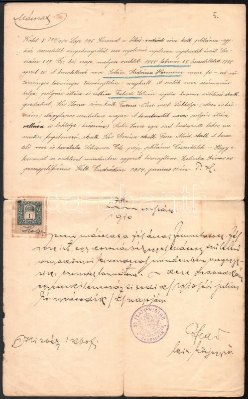 1910 Közjegyzői okmányok, 4 db, okmánybélyegekkel