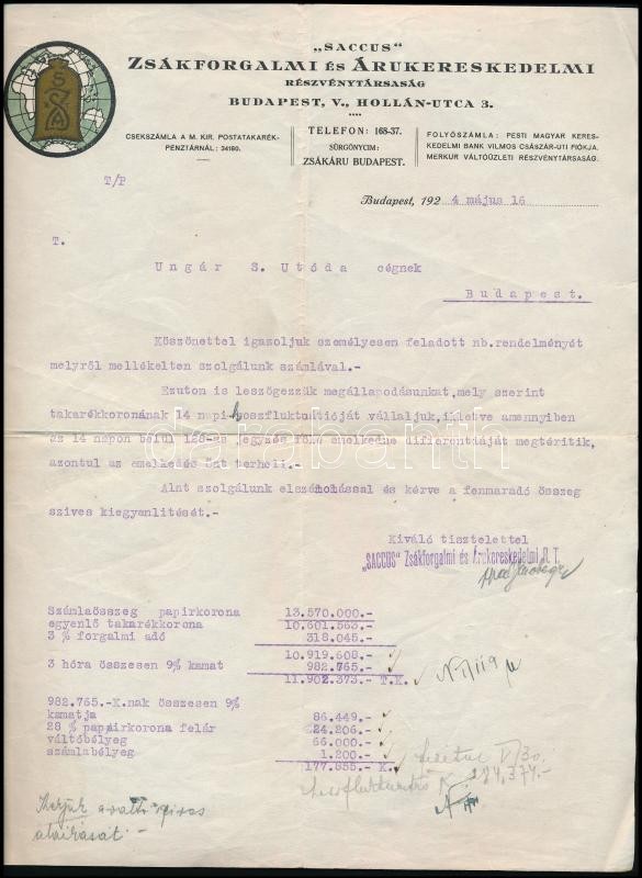 Leírás: 1924 Bp.V., "Saccus" Zsákforgalmi és Árukereskedelmi Részvénytársaság fejléces levélpapírjára írt levél