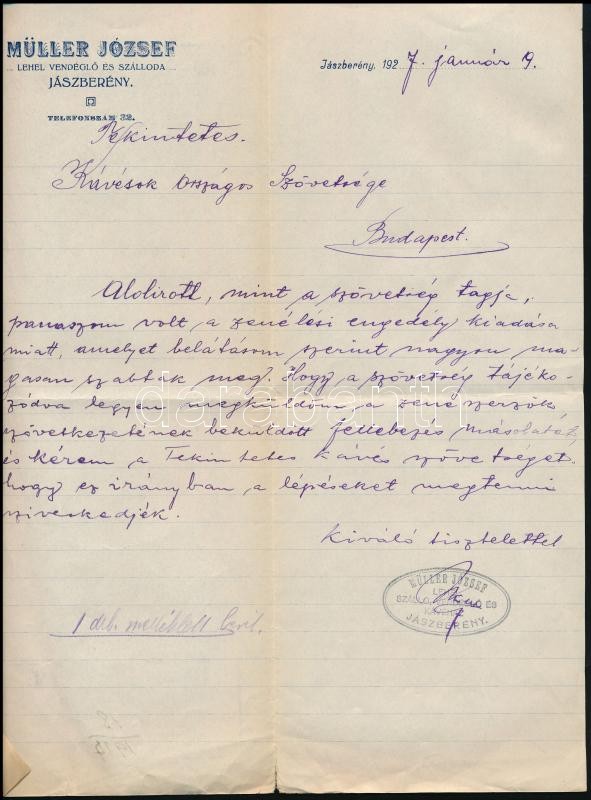 Leírás: 1927 Jászberény, Müller József Lehel vendéglő és Szálloda fejléces levélpapírjára írt levél