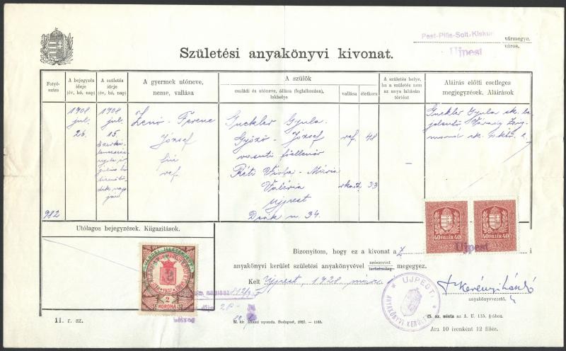 Leírás: 1928 Újpest, Születési anyakönyvi kivonat illetékbélyegekkel