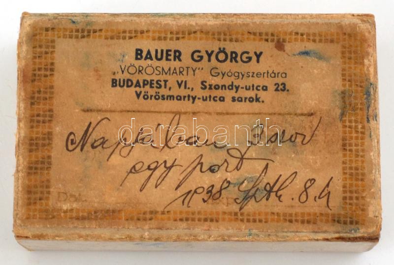 Leírás: Bauer György "Vörösmarty" Gyógyszertára (Bp. VI. Szondi utca) kartondoboza, 4×7×2 cm
