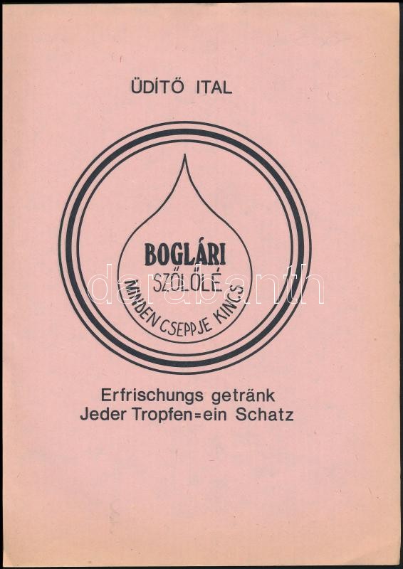 Leírás: Boglári Szőlőlé - Minden cseppje kincs, reklámnyomtatvány, 29×21 cm