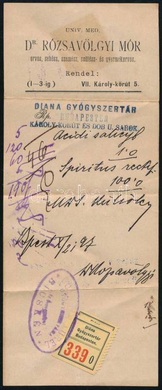 Leírás: cca 1900 Budapest Diána gyógyszertár receptboríték, tartalommal