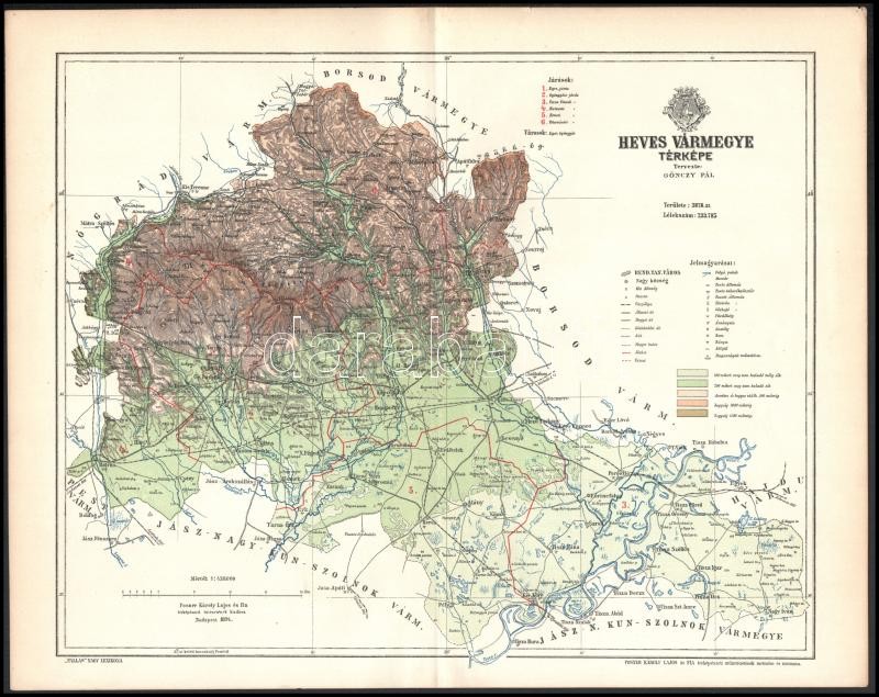 Leírás: 1894 Heves vármegye térképe, tervezte: Gönczy Pál, készült: Posner Károly Lajos és Fia, 24×30 cm