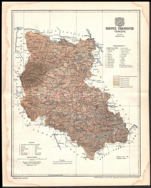 Leírás: 1897 Szepes vármegye térképe, tervezte: Gönczy Pál, készült: Posner Károly Lajos és Fia, 24×30 cm