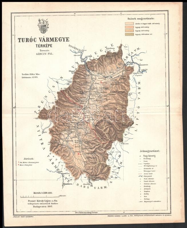 1897 Turóc vármegye térképe, tervezte: Gönczy Pál, készült: Posner Kár... https://www.darabanth.com/hu/359-Gyorsarveres/359.0/Mutargy-papirregiseg-egyeb/Terkepek~500029/1897-Turoc-varmegye-terkepe-tervezte-Gonczy-Pal-keszult-Posner-Karoly-Lajos-es-Fia-24~II2062686