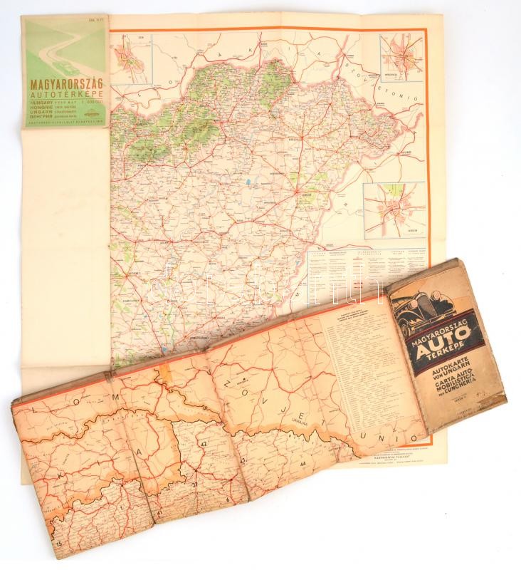 cca 1940 Magyarország autó térképe. Tervezte és rajzolta: Zajzon V. Bp., Kókai Lajos, javított, szakadt, az ismertetőnél pótlással,megviselt állapotban, 66x107 cm.+1960 Magyarország autó térképe, a szélén szakadással, 66x96 cm