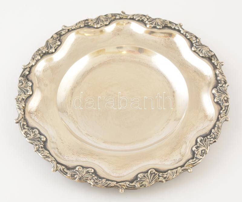 Leírás: Ezüst (Ag.) tál, jelzett, szélén plasztikus díszítéssel, d:24 cm nettó:390 g (együtt)