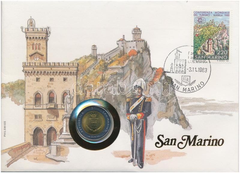 San Marino 1983. 500 Lire in envelope with stamp and cancellation, with German description C:UNC