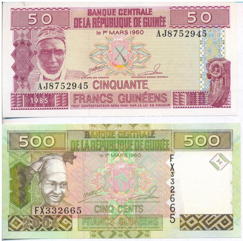 Guinea 1985. 50 Francs + 2006. 50... https://www.darabanth.com/hu/359-Gyorsarveres/359.0/Numizmatika/Kulfoldi-bankjegyek~2000013/Guinea-1985-50Fr-plus-2006-500Fr-TI-Guinea-1985-50-Francs-plus-2006-500-Francs-CUNC-Krause-29a-3~II2049434
