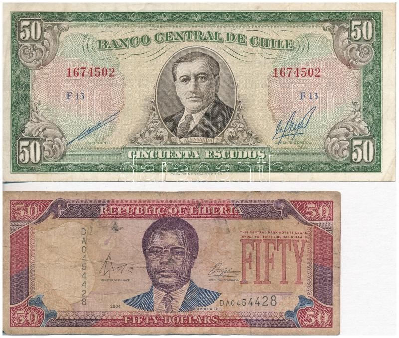 Mixed: Chile ... https://www.darabanth.com/hu/359-Gyorsarveres/359.0/Numizmatika/Kulfoldi-bankjegyek~2000013/Vegyes-Chile-1962-1975-50E-plus-Liberia-2004-50D-TIII--Mixed-Chile-1962-1975-50-Escudos-plus-Liber~II2062594