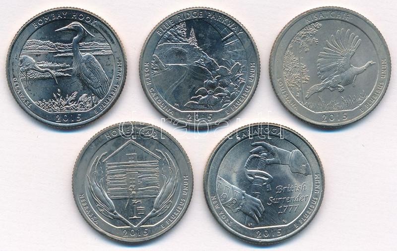 Amerikai Egyesült Államok 2015. 1/4$ "Nemzeti parkok - Bombay Hook, Blue Ridge Parkway, Kisatchie, Saratoga, Homestead" Cu-Ni (5xklf) kapszulában T:1-,2 USA 2015. 1/4 Dollar "National Parks - Bombay Hook, Blue Ridge Parkway, Kisatchie, Saratoga, Homestead" Cu-Ni (5xdiff) in capsule C:AU,XF