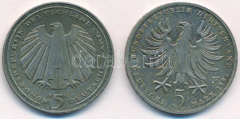 NSZK 1985G 5M Cu-Ni "150 éves a Német Vasút" + 1986F 5M Cu-Ni "Nagy Frigyes halálának 200. évfordulója" T:2 patina